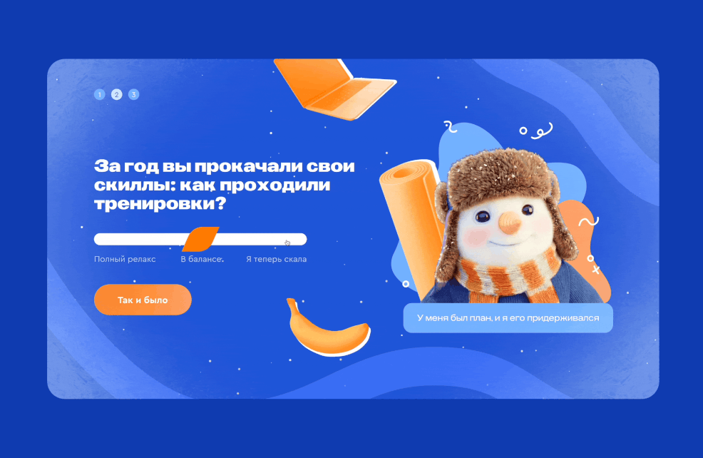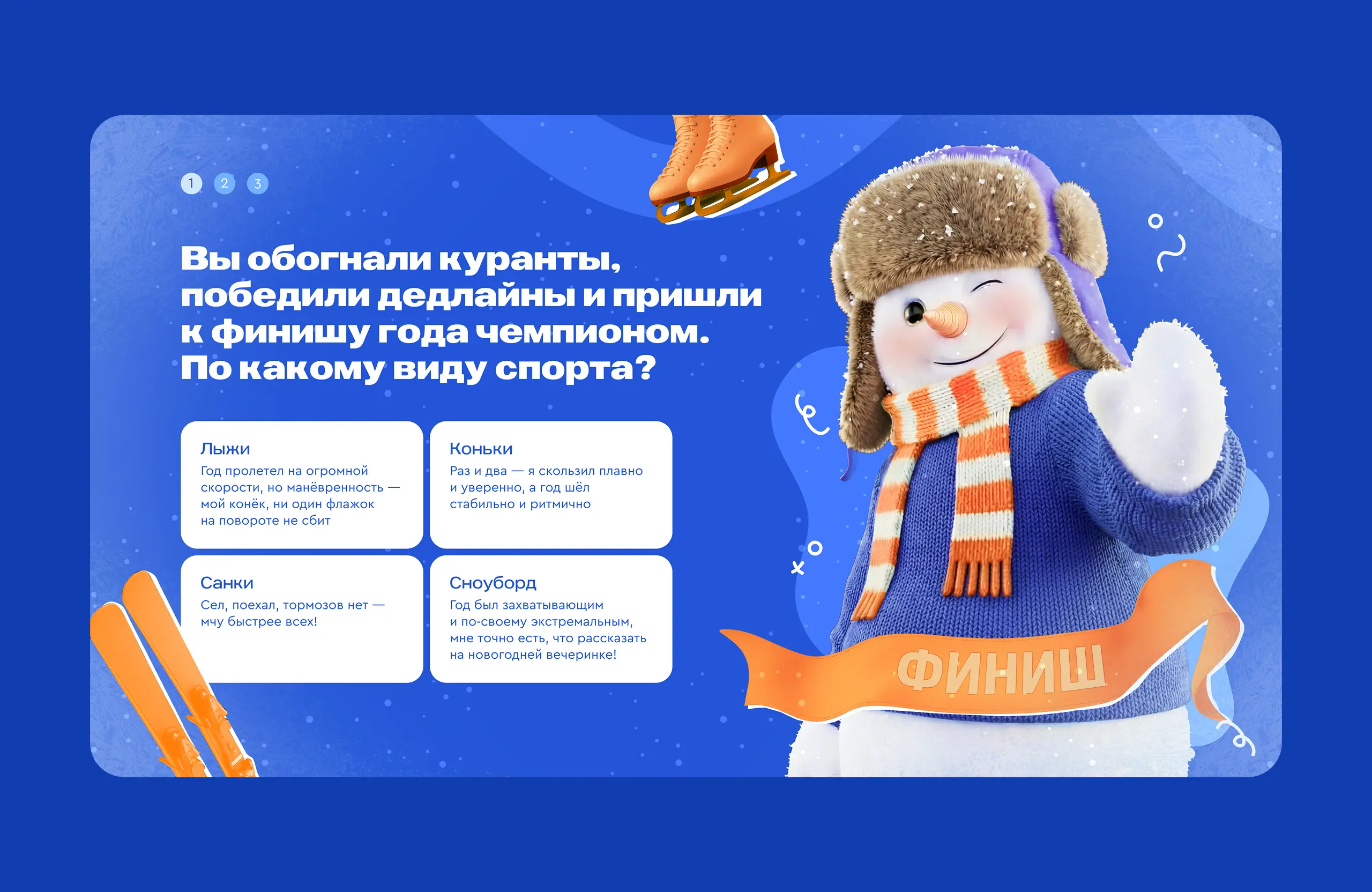 У Газпромбанка был привычный пульс-опрос, но HR-команда искала способ собрать обратную связь так, чтобы это ощущалось легко и не выглядело нудной обязанностью. Вместо очередной анкеты мы сделали диджитал-тест с метафорами зимнего спорта и финальной грамотой, которую хочется сохранить и показать коллегам.